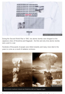 The shirt, which is still available for sale online, bears the slogan “Patriotism Our History Liberation Korea” and features an iconic photo of the atomic bomb dropped on a Japanese city.